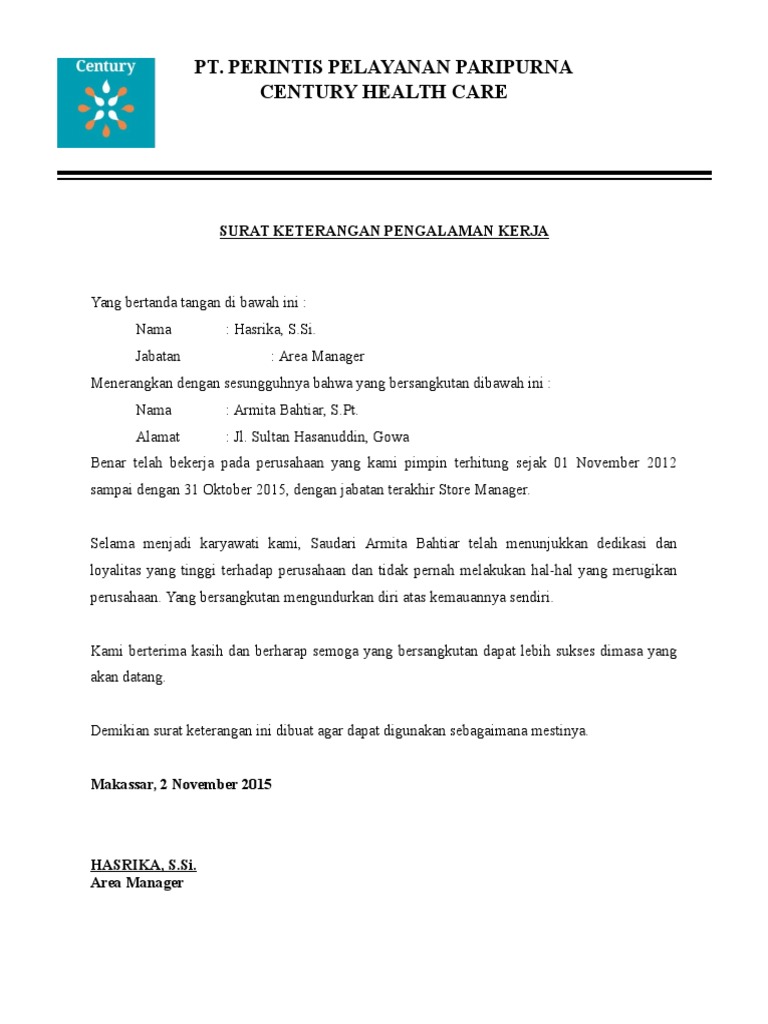 Hampir semua perusahaan besar saat ini lebih senang merekrut karyawan baru berpengalaman dari pada fresh graduate. Selain sebagai bukti bahwa seseorang pernah bekerja pada sebuah perusahaan, surat pengalaman kerja ini juga mempunyai fungsi sebagai referensi atau. Bersama surat ini kami kalau anda sudah memiliki beberapa surat pengalaman kerja dari beberapa perusahaan terdahulu, sebaiknya anda arsip dengan baik surat. Surat pengalaman kerja ialah merupakan sebuah surat yang diberikan oleh perusahaan tertujuauntuk mantan dimana di dlaam surat ini berisi suatu keterangan mengenai masa karyawan tersebut mulai bekerja mulai dari tanggal. Surat pengalaman kerja biasanya akan dibuat perusahaan untuk karyawan yang telah mengundurkan diri dari perusahaan tempatnya bekerja.